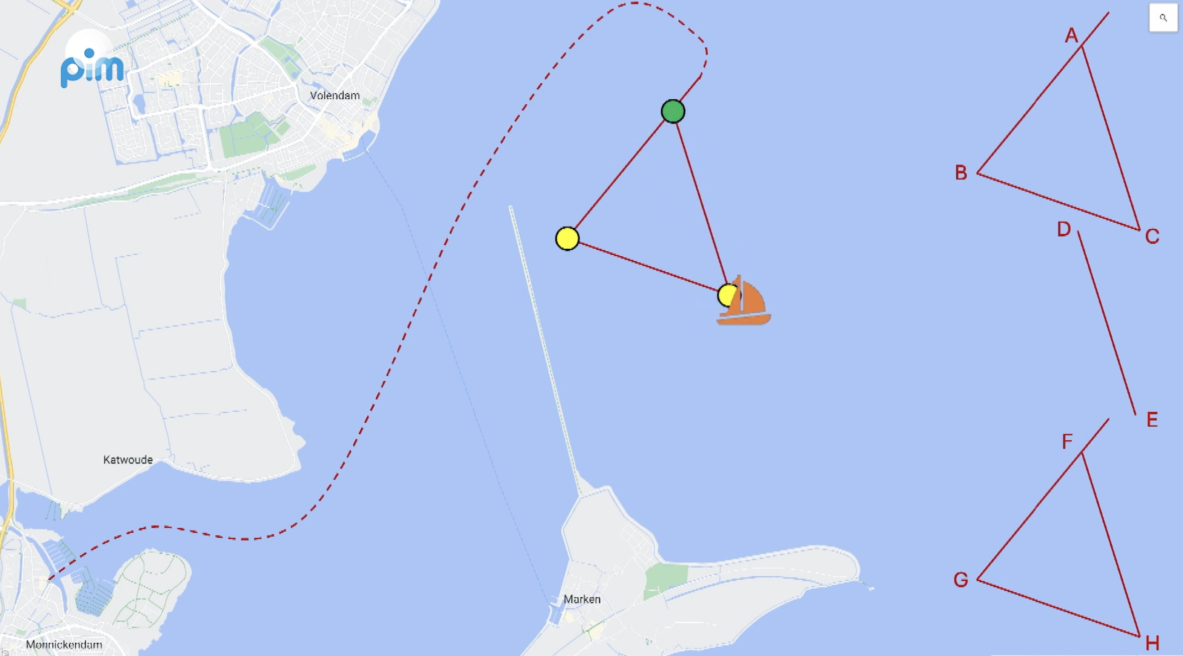 Er wordt gevaren in drie verschillende klassen die apart van elkaar – met tussenpozen – starten. Er wordt gevaren in een driehoeksbaan (zie afbeelding). Start bij ‘A’ en dan alfabetisch richting de finish.